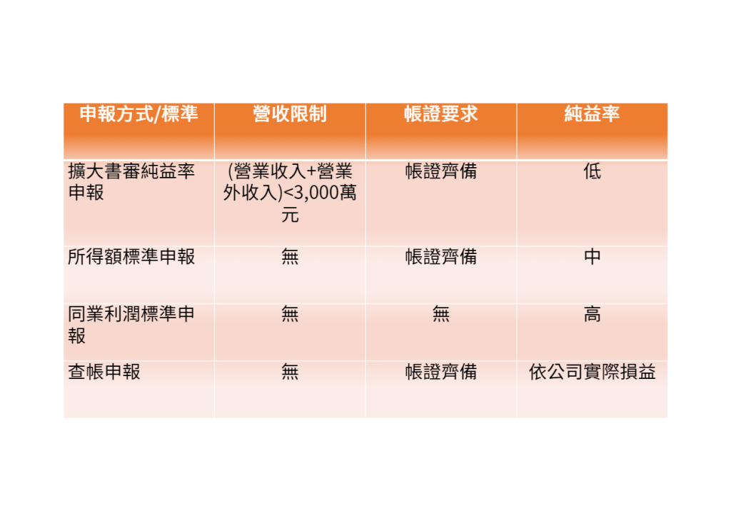 考量稽徵的成本效益,營利事業所得稅共有以下四種申報方式: