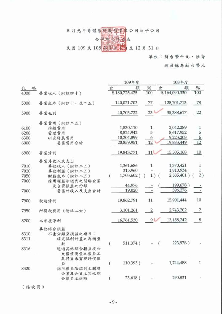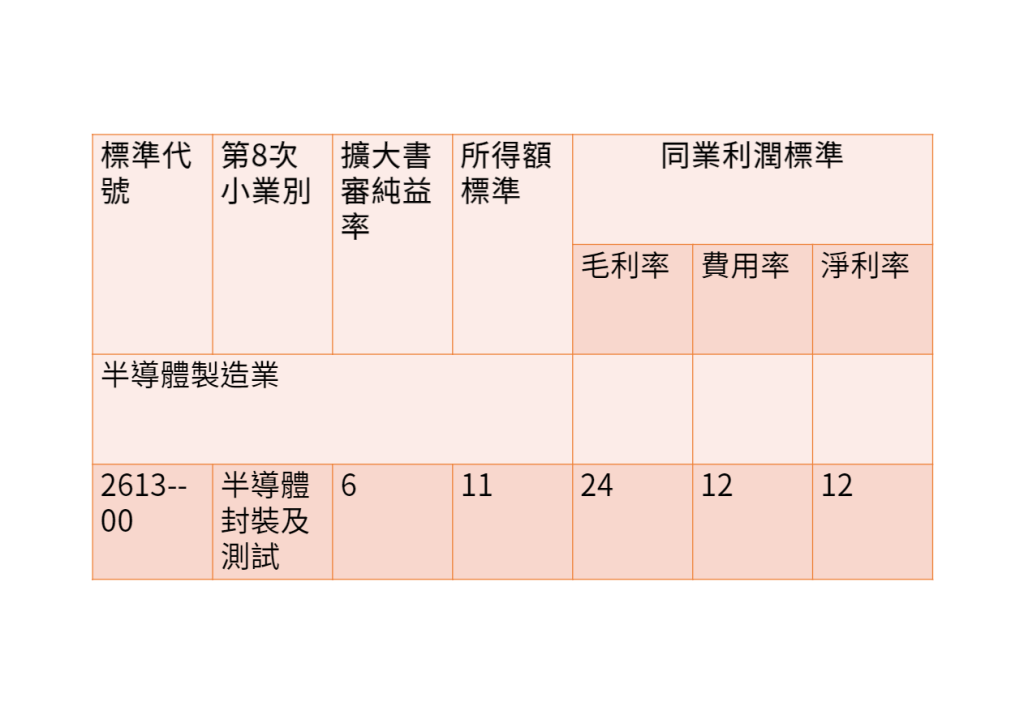 為了方便大家參照,我在重要比率的旁邊都註記了紅色的勾。下圖則是稽徵機關所發布的109年度半體體封裝與測試產業適用的各項比率: